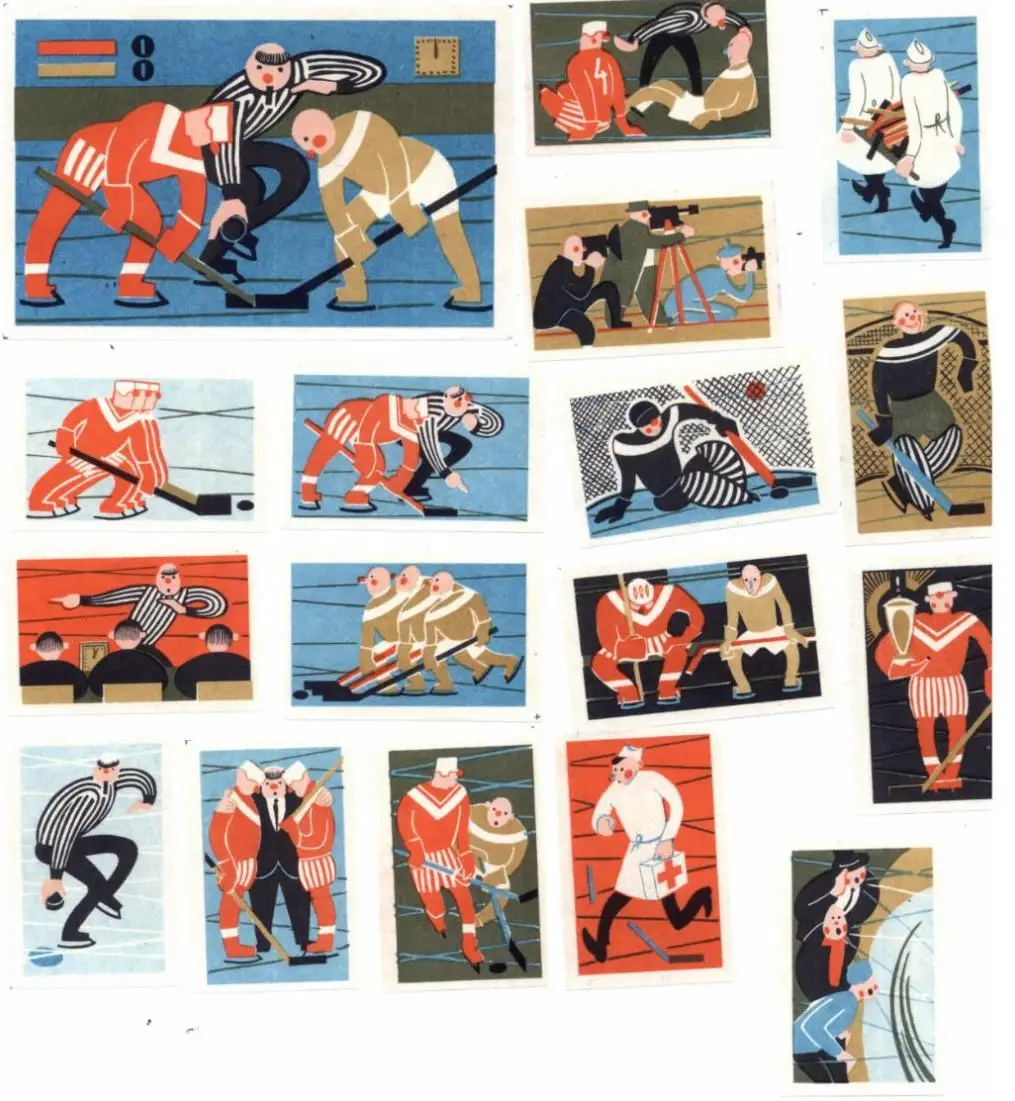 SPORT - EISHOCKEY, 17 russische Zündholzettiketten in Comic art