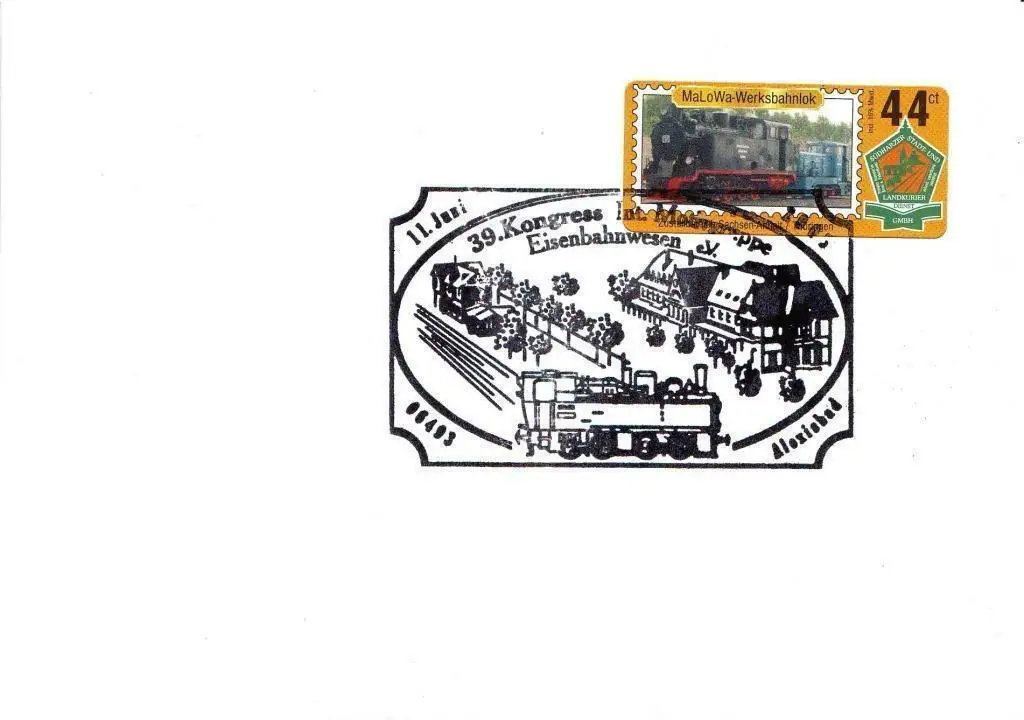 selbstklebend, gerade gestanzt, Sonderbeleg "39. Kongress der Internationalen Motivgruppe Eisenbahnwesen e. V. in Alexisbad", Sonderstempel (klein), echt gelaufen in das Land Brandenburg