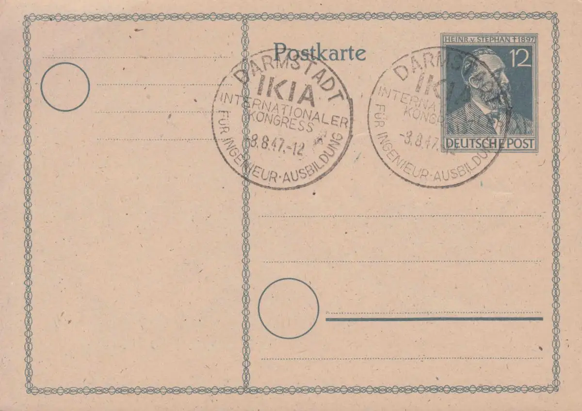 SSt DARMSTADT IKIA Ingenieur-Ausbildung 8.8.1947 auf Postkarte P 965 Stephan