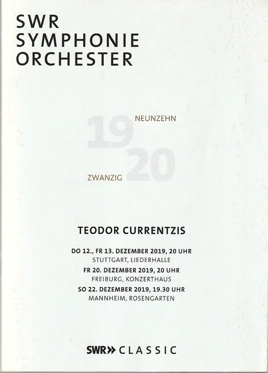 weitere Konzerte 20. Dezember 2019 Konzerthaus Freiburg, 22. Dezember 2019 Rosengarten Mannheim. SWR Symphonieorchester. Dirigent: Teodor Currentzis. Programm: GUSTAV MAHLER: Sinfonie Nr. 9 D-Dur - Theaterprogramm, Opernprogramm, Ballettprogramm, Musicalprogramm, Konzertprogramm, Theatermemorabilia, Programmhefte Sammlung, deutsche Theatergeschichte.