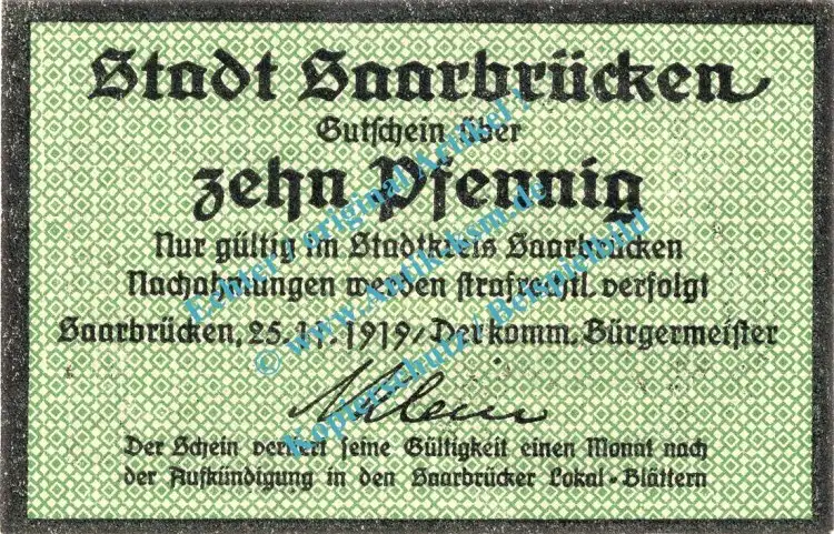 Saarbrücken , Notgeld 10 Pfennig Schein in kfr. Tieste 6335.10.10 , Rheinland 1919 Verkehrsausgabe