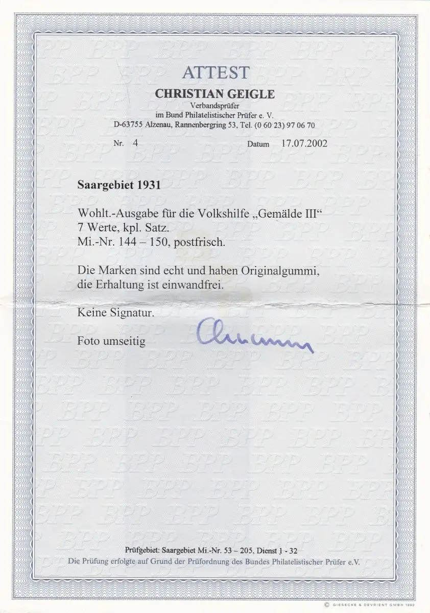 Saargebiet: MiNr. 144-150, postfrisch, BPP Attest