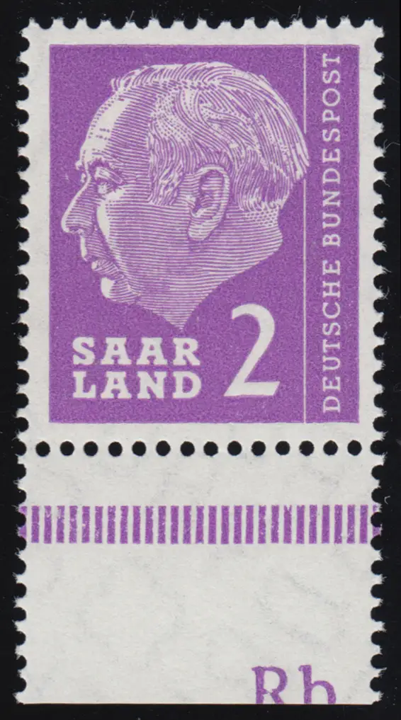Saarland 381 Heuss 2 (Fr) 1957 - Unterrand mit Druckerzeichen Rb, ungefaltet, **
