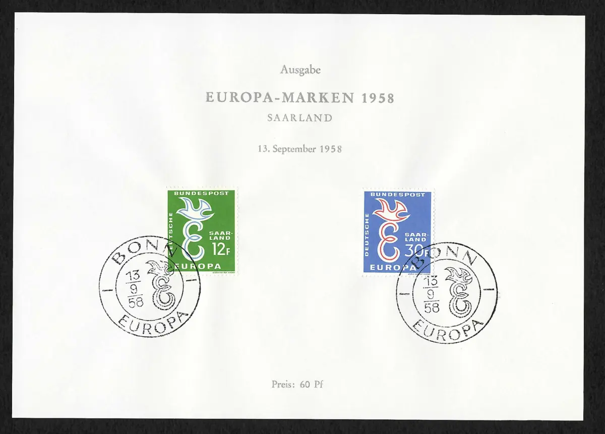 Saarland: Europa 1958: #439-440, auf Sonderblatt - Sonderstempel Bonn