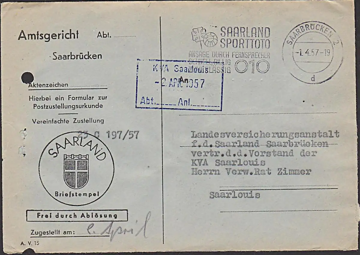 Saarland "Frei durch Ablösung" Saarbrücken MWSt. "Saarland Sporttotto Ansage ..." 1957 Amtsgricht