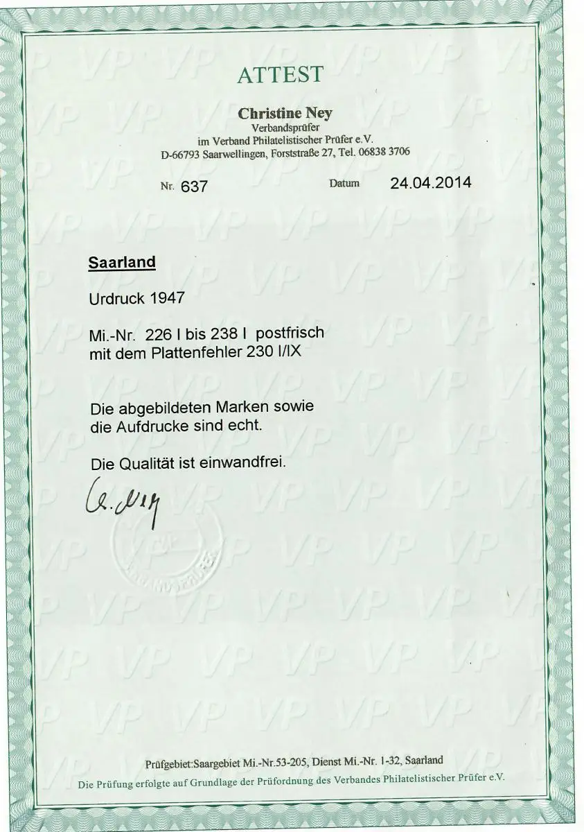 Saarland: MiNr. 226I bis 238I, Plattenfehler 230 I/IX, postfrisch, **