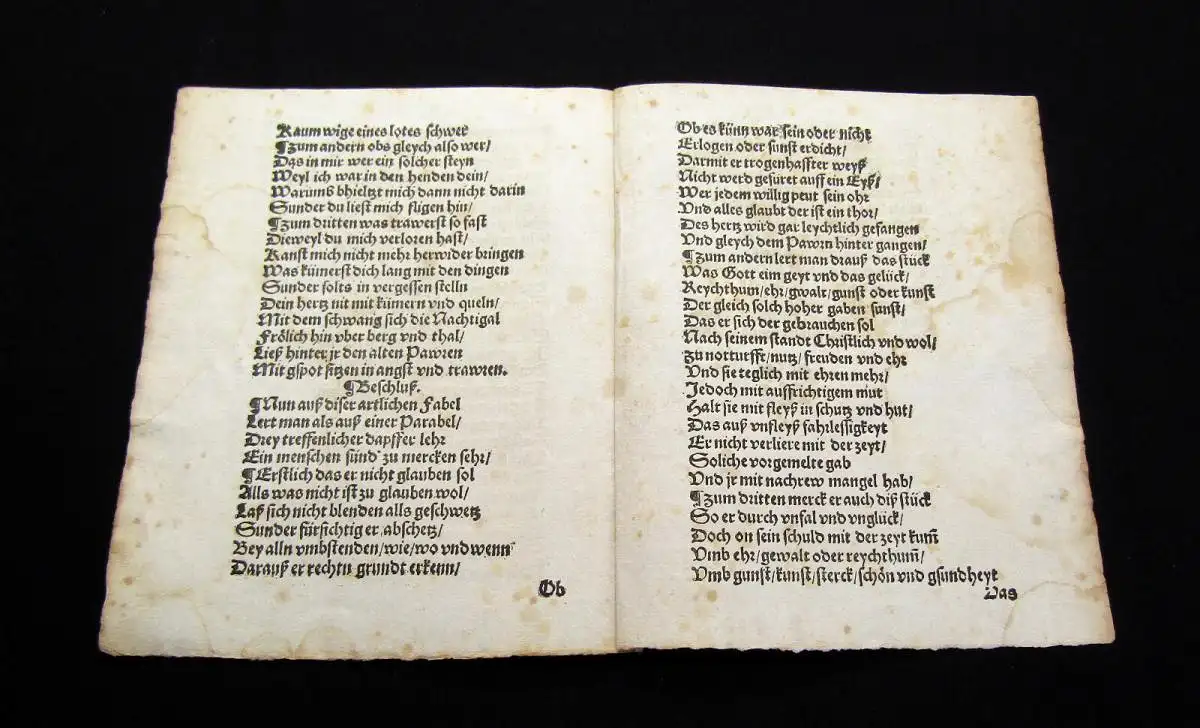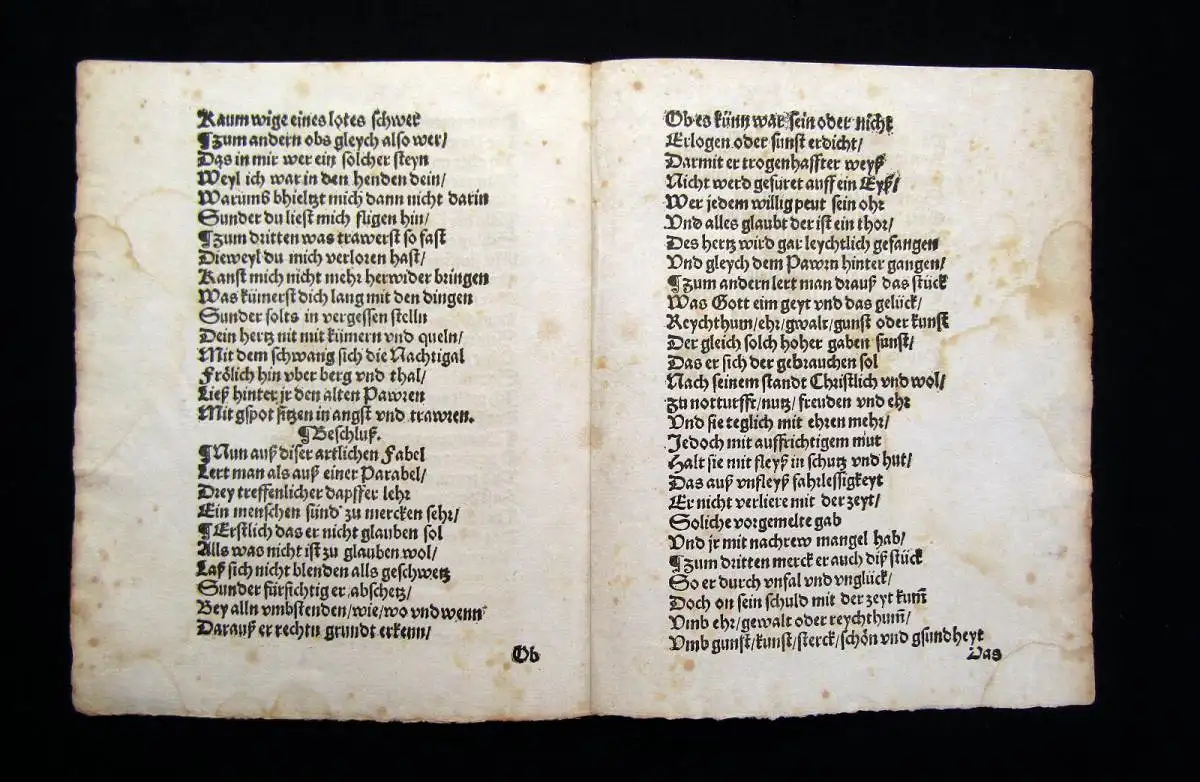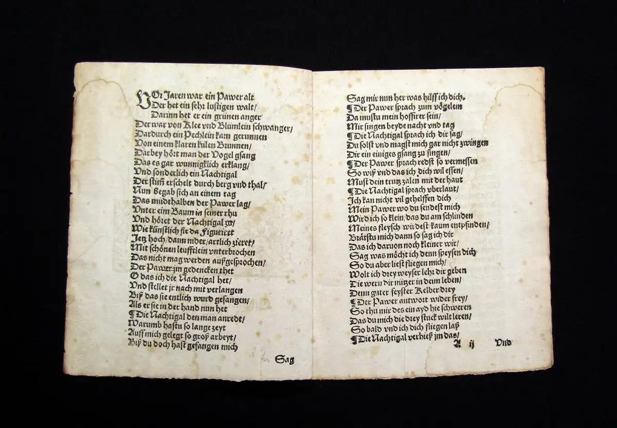 Der Titelholzschnitt (ca. 10,3 cm x 4,3 cm) von Erhard Schön zeigt drei Putti inmitten von Rosenranken. Das allegorische Reimgedicht - ein Gespräch zwischen einem Bauern und einer Nachtigal - basiert auf der Aesop-Übertragung von Heinrich Steinhöwel, die 1476 in Ulm gedruckt wurde.