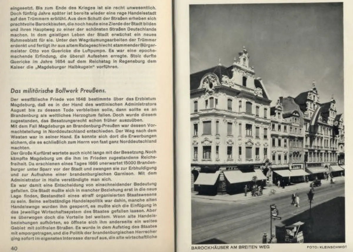 mit GESAMT 48 Seiten photographischen und druckgraphischen Abbildungen Kultur und Siedlungsgeschichte des Magdeburger Raumes Magdeburg als Kaiserpfalz die Gründung der Stadt und ihre Bedeutung der Stadt im Mittelalter das Bistum Magdeburg und die deutsche Ostexpansion. Magdeburg als Hansestadt das Magdeburger Stadtrecht und der sächsische Städtebund im Kampf gegen den Erzbischoff. Der Beginn der Reformation und die Belagerung der Stadt 1550 weitere Entwicklung bis zum 30jährigen Krieg. Die Plünderung und Zerstörung der Stadt durch Tilly im Jahre 1631 Wiederaufbau und Übergang Magdeburgs an Preussen die Stadt als Festungs und Garnisionstadt Napoleon und Befreiungskriege weitere Entwicklung bis zur Gegenwart.