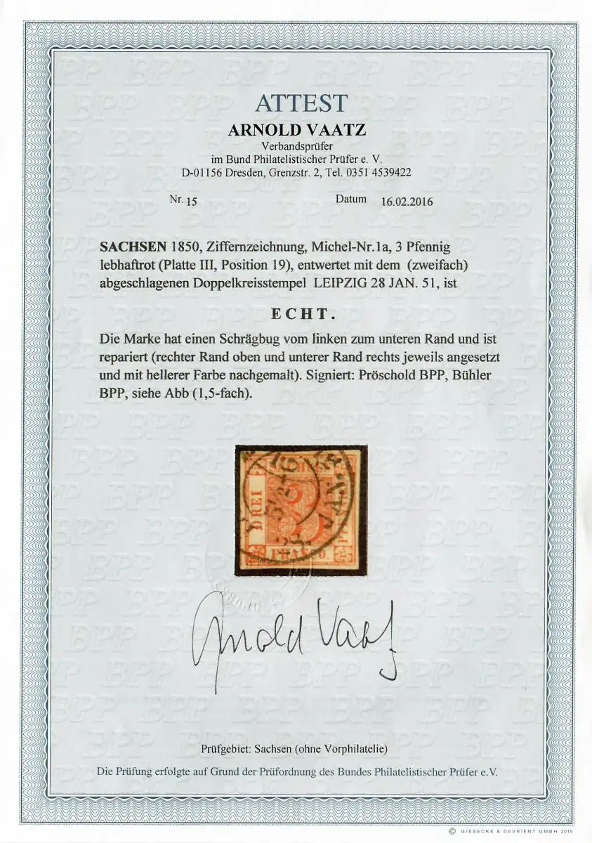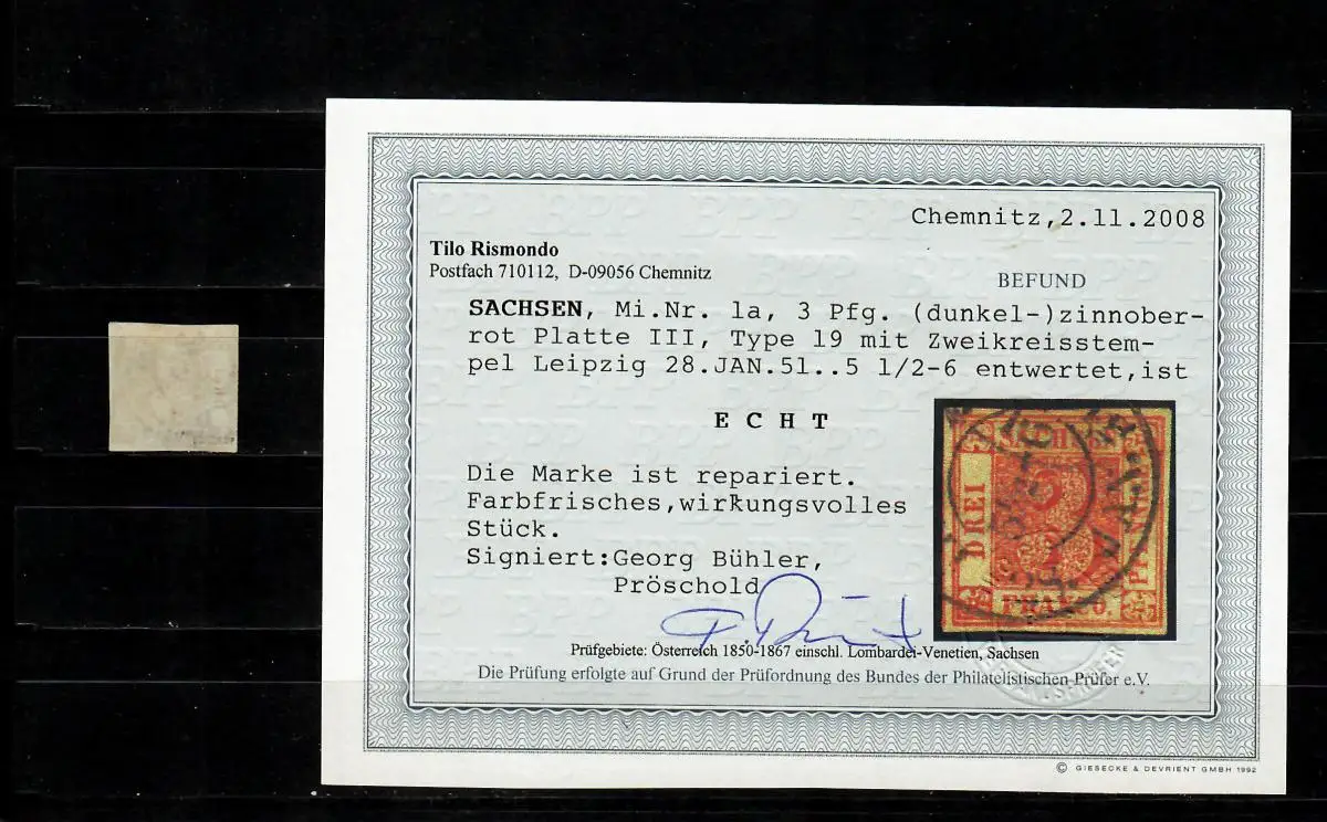 Sachsen: MiNr. 1a, gestempelt Leipzig, Doppekreisstempel, BPP Attest