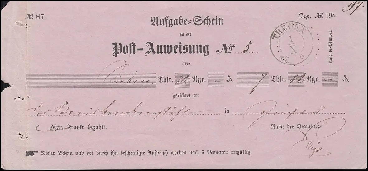 Sachsen: Postanweisung Aufgabeschein Zweikreisstempel TREUEN 1.10.1867