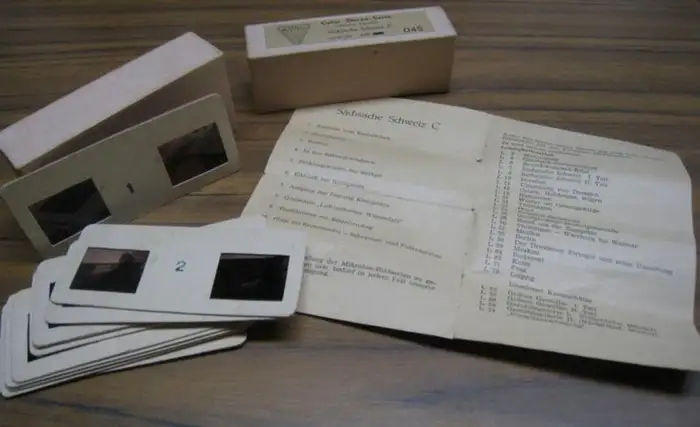 10 originale Pappkärtchen im Format 4,5 x 10 cm, darin eingelassen je 2 farbige Dias mit den Maßen 2 x 3 cm. Eingelegt in der Original-Schachtel mit montiertem Titelschild. Beiliegend ein Doppelblatt mit Bildverzeichnis sowie Verweis auf weitere erschienene Serien, davon wurden einige mit schwarzem Stift unterstrichen. Sauberer, guter Zustand
