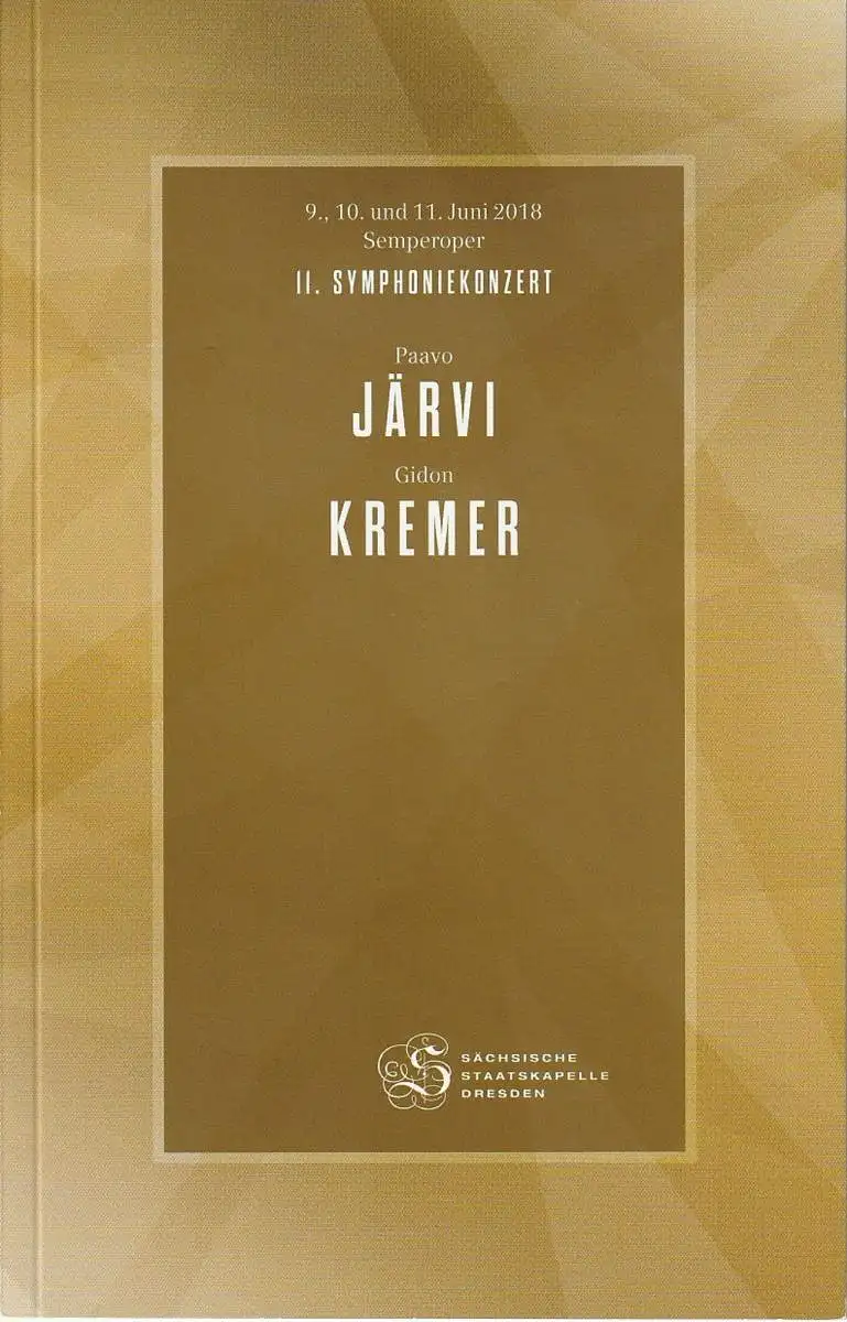 Mitwirkende: Paavo Järvi ( Dirigent ), Gidon Kremer ( Violine ). ZUFLUCHT UND DRANG. Programm: Arvo Pärt: Swansong für Orchester / Mieczyslaw Weinberg: Konzert für Violine und Orchester g-Moll op. 67 / Jean Sibelius: Lemminkäinen-Suite op. 22 ( Vier Legenden ) - Schlüsselwörter: Theaterprogramm, Opernprogramm, Ballettprogramm, Musicalprogramm, Konzertprogramm, Theatermemorabilia, Programmhefte Sammlung, deutsche Theatergeschichte.