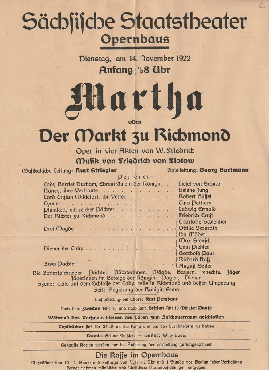 Oper in vier Akten von W. Friedrich. Musik von Friedrich von Flotow. Musikalische Leitung: Kurt Striegler. Spielleitung: Georg Hartmann. Mitwirkende: Liesel von Schuch, Helene Jung, Robert Büssel, Tino Pattiera, Ludwig Ermold, Friedrich Ernst, Charlotte Schlenker, Ottilie Schurath, Ida Mäder, u.a. - Theaterprogramm, Opernprogramm, Ballettprogramm, Musicalprogramm, Konzertprogramm, Theatermemorabilia, Programmhefte Sammlung, deutsche Theatergeschichte.