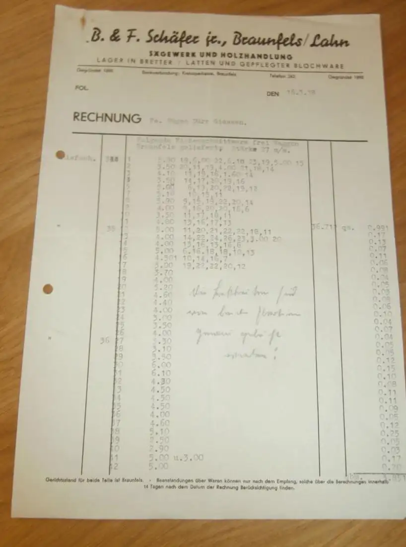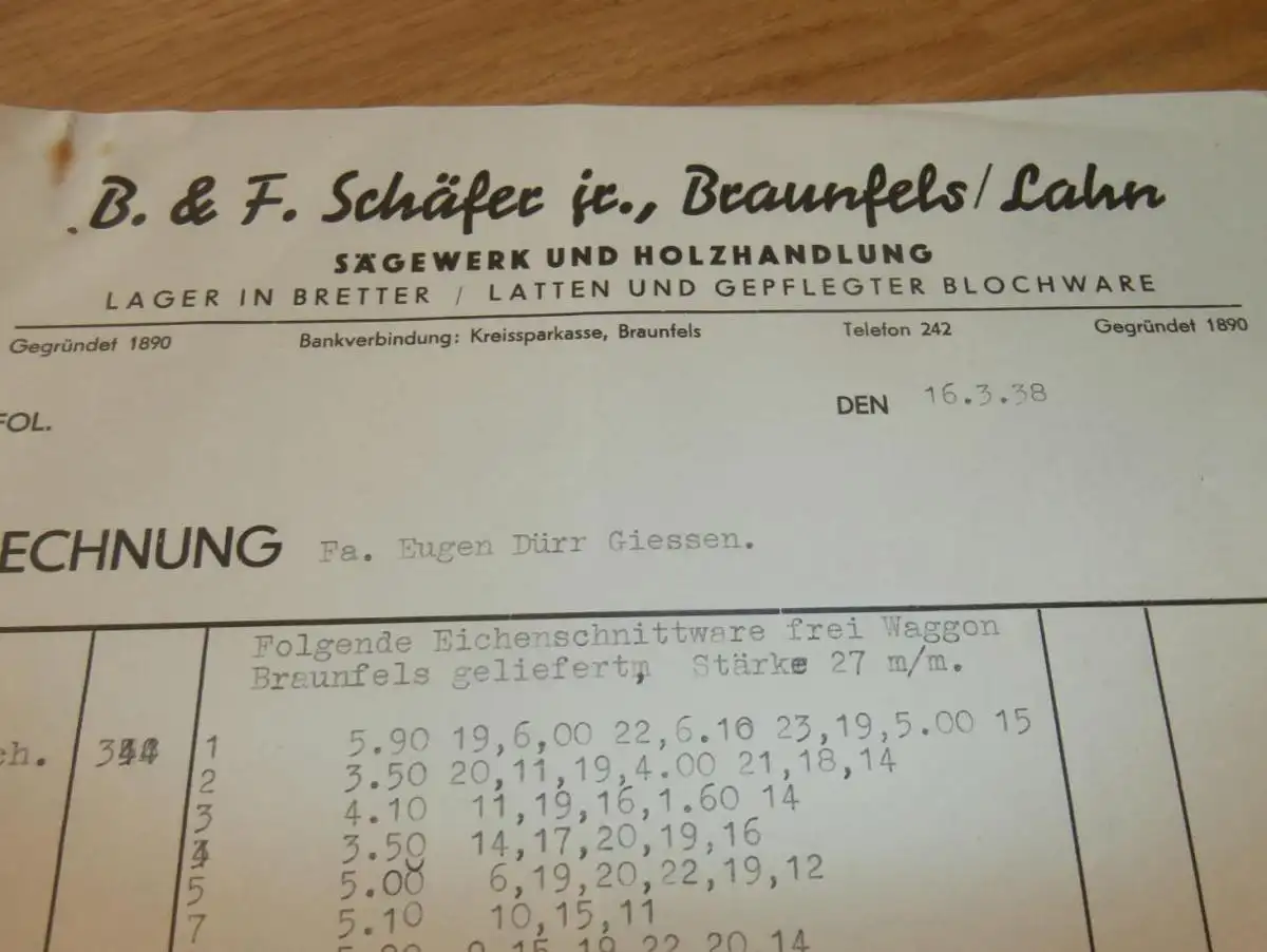 Sägewerk und Holzhandel B.& F. Schäfer in Braunfels a. Lahn , 1938 , alte Rechnung , altes Dokument !