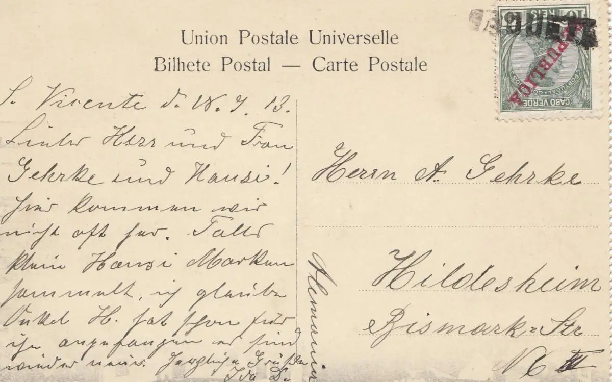 Saint Vincent 1913: post card Cabo Verde to Hildesheim