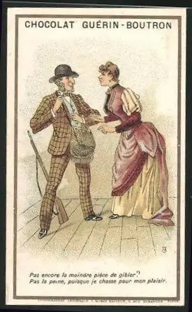 Sammelbild Chocolat Guerin-Boutron, Pas ensore la moindre piece de gibier?.., Jäger und Dame
