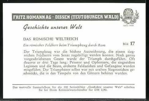 Sammelbild Fritz Homann AG, das Römische Weltreich, ein römischer Feldherr beim Triumphzug durch Rom