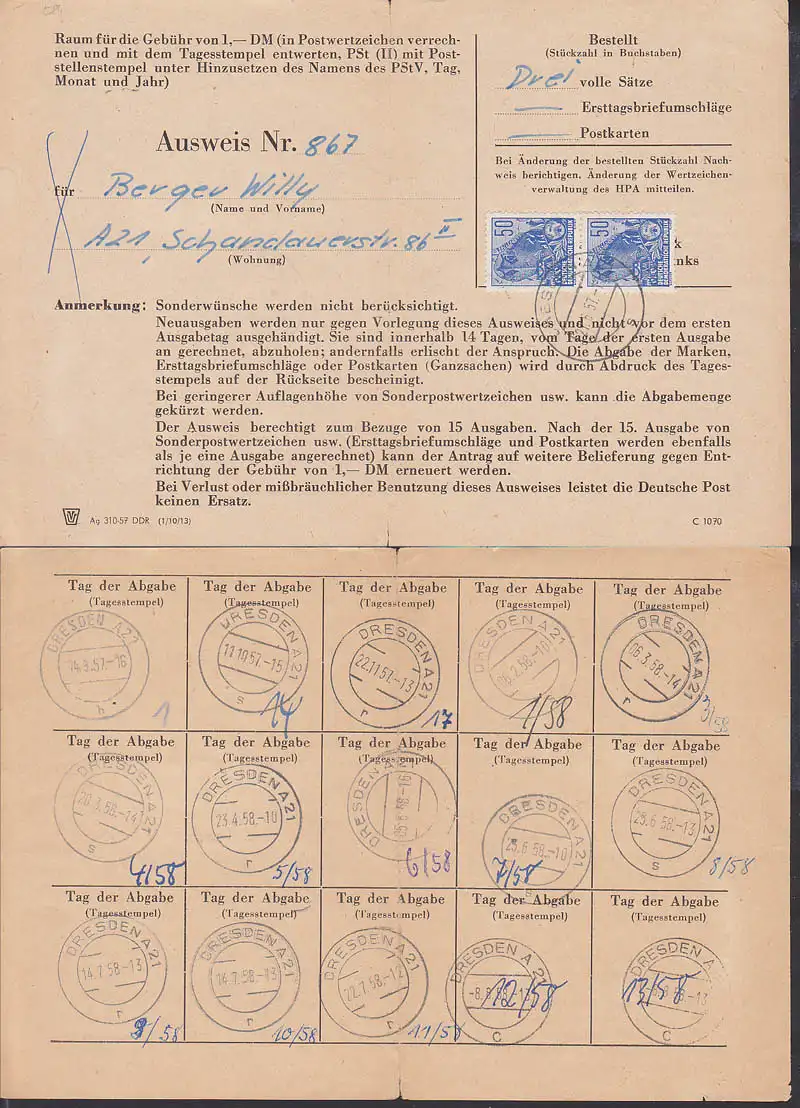Sammlerausweis der DDR, Dresden A21 21.6.57 frankiert mit zwei 50 Pfg. 5-Jahrplanmarken (584)