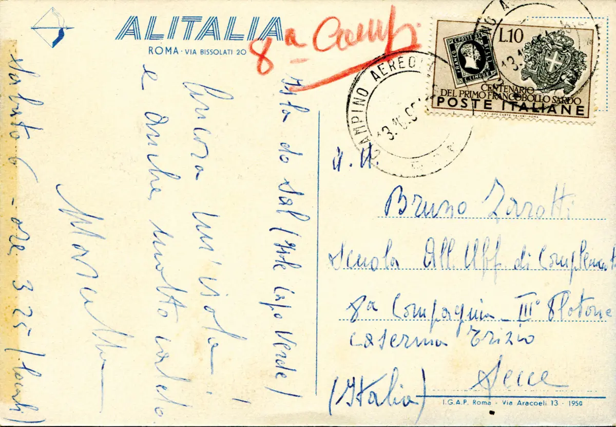 Sardinien Lire 10 Nr. 672 isoliert auf Werbekarte Alitalia Postkarte - Sardinien Lire 10 Nr. 672 isoliert auf Werbekarte Alitalia reiste am 13.10.51 von Ciampino nach Lecce zum Militär - Selten in der Zeit Cod. 288/14
