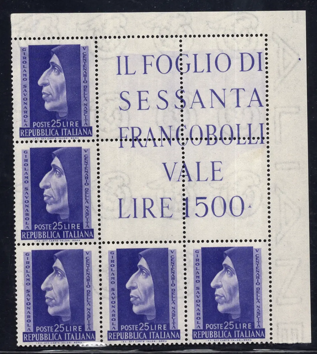MNH - Vollgummi - Girolamo Savanarola Nr. 696 Eckblock von fünf Exemplaren (Katalog Eckblöcke Nr. 18) perfekt, gut zentriert mit Vollgummi - Kat. euro 70 Cod. 2962/WEB
