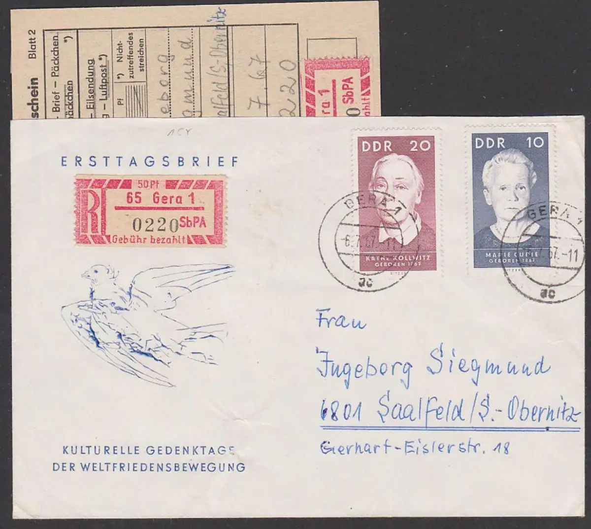 SbPA 65 GERA Einschreiben "Gebühr bezahlt" mit Einl.-Schein Versuchsausgabe 1Cx 6.7.67