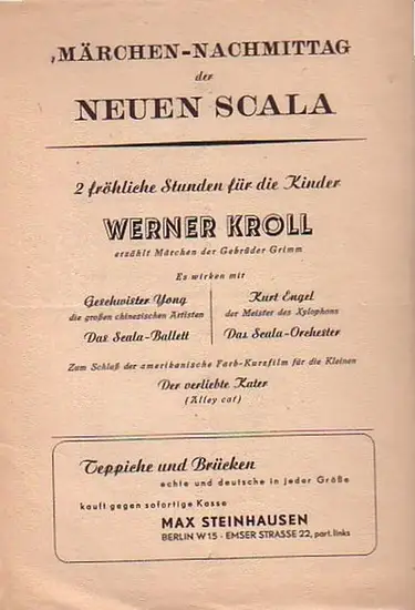 Titel: Programm - Zettel zu: Märchen - Nachmittag der Neuen Scala. 2 fröhliche Stunden für die Kinder. Werner Kroll erzählt Märchen der Gebrüder Grimm. Mitwirkende: Geschwister Yong, Scala - Ballett, Scala - Orchester unter Willi Sommerfeld, Kurt Engel. Neue Scala 1946