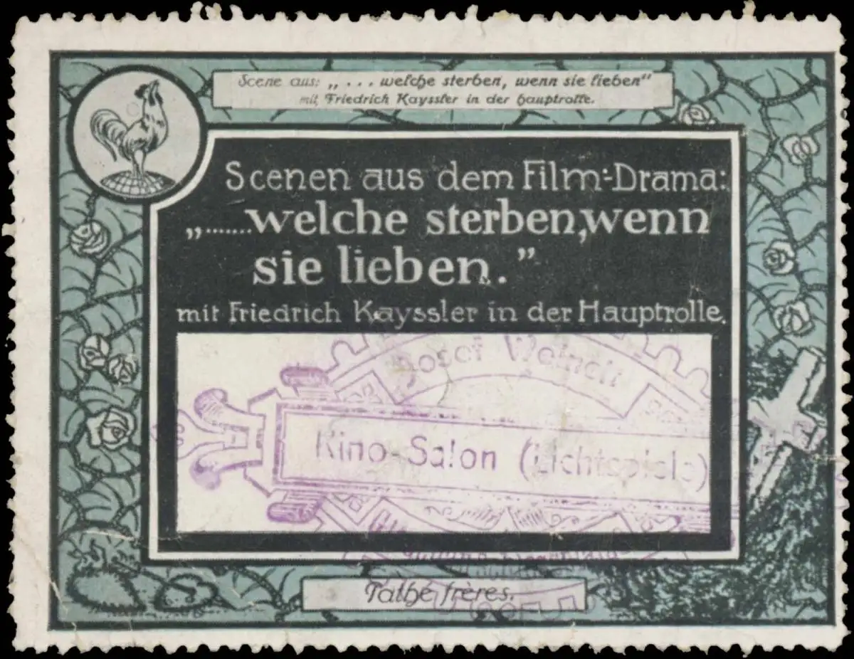 Kino, Film, mit Friedrich Kayssler, Kino-Salon, Glauchau, Schloßplatz 2 und Markstr. 8, Inhaber: J. Weinelt, Pathé frères, Größe/Zustand: 5x7 , leicht beschädigt, Original alte Reklamemarke die seinerzeit für die Werbung benutzt wurde