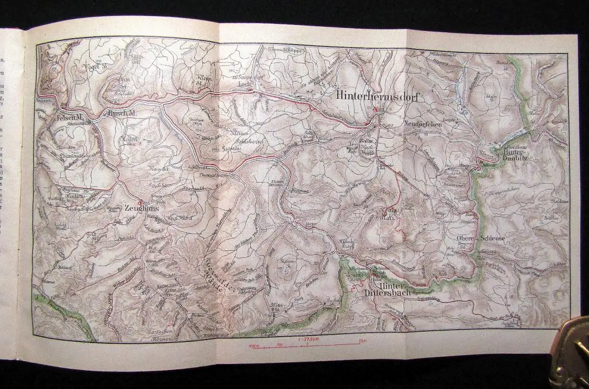 Einband etwas berieben und bestoßen. Papier gering gebräunt, stellenweise leicht braun- und fingerfleckig. Einschub für die Karte fast vollständig aufgerissen.
