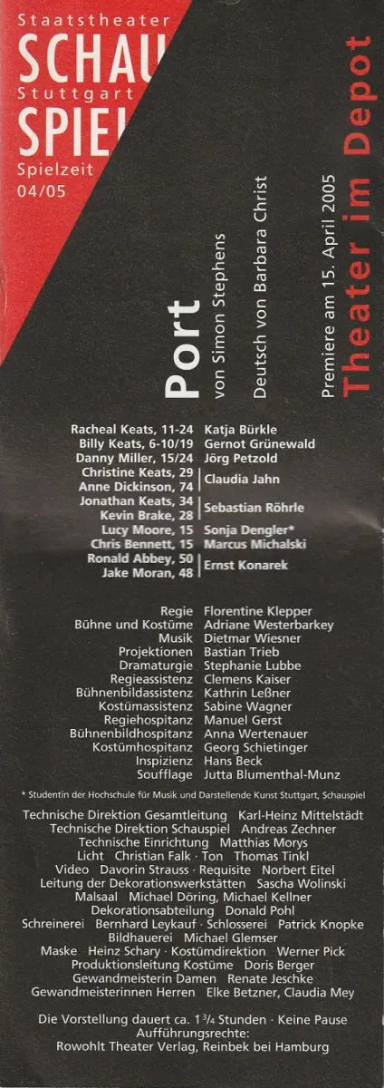 Schauspiel Staatstheater Stuttgart, Friedrich Schirmer, Stephanie Lubbe, Frieder Grindler: Programmheft Simon Stephens PORT Premiere 15. April 2005 im Depot Spielzeit 2004 / 05.