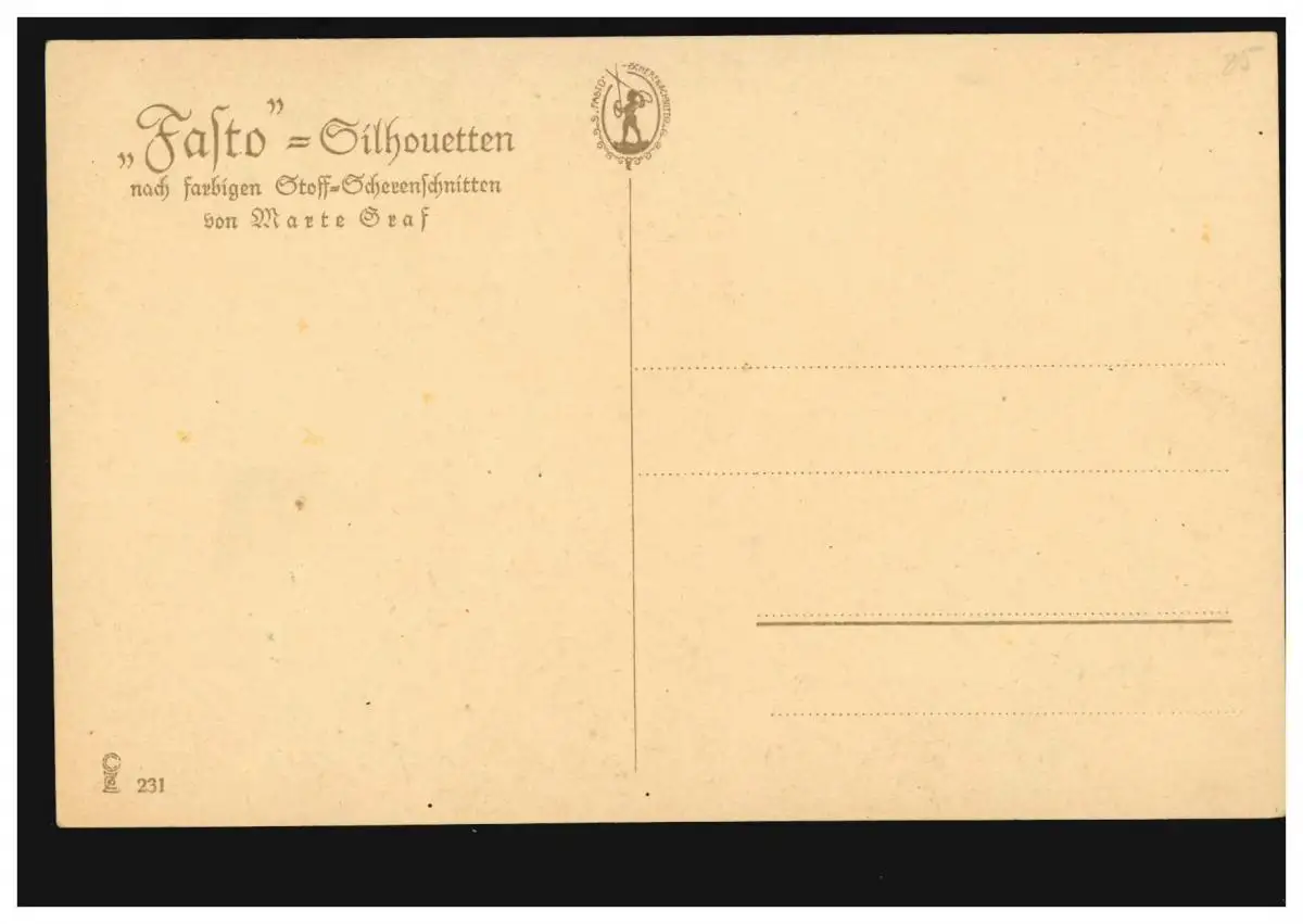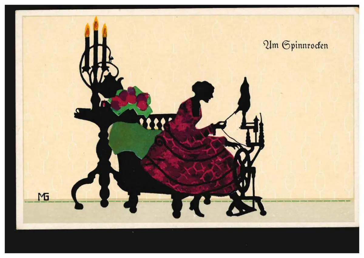 Scherenschnitt-AK Marte Graf: Am Spinnrocken, Fasto-Silhouetten, ungebraucht
