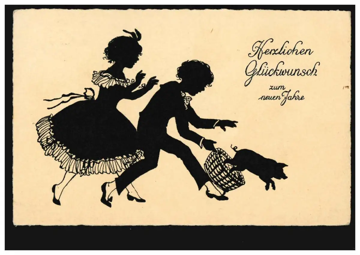 Scherenschnitt-AK Neujahr Kinder mit Glücksschwein, Pittius-Verlag, GRAZ 1928