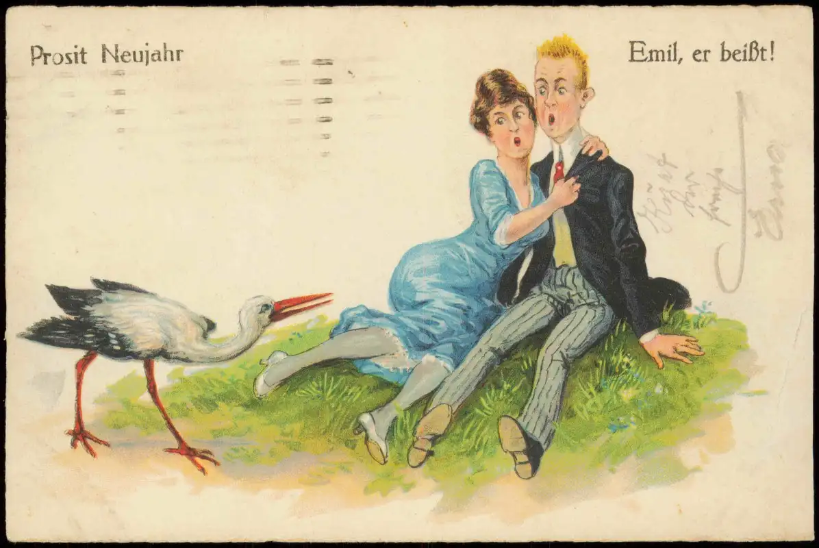 Scherzkarte Prosit Neujahr Emil, er beißt! Ehepaar und STORCH 1926