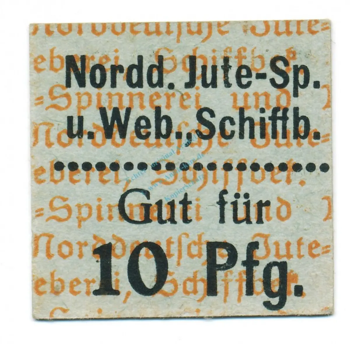 Schiffbek , Notgeld 10 Pfennig Schein unc-kfr. Tieste 6495.05.6 , Schleswig o.D. VerkehrsausgabeGutschein , Notgeld : Norddeutsche Jute Spinnerei und Weberei Schiffbek , "Pfg." breit & schmal