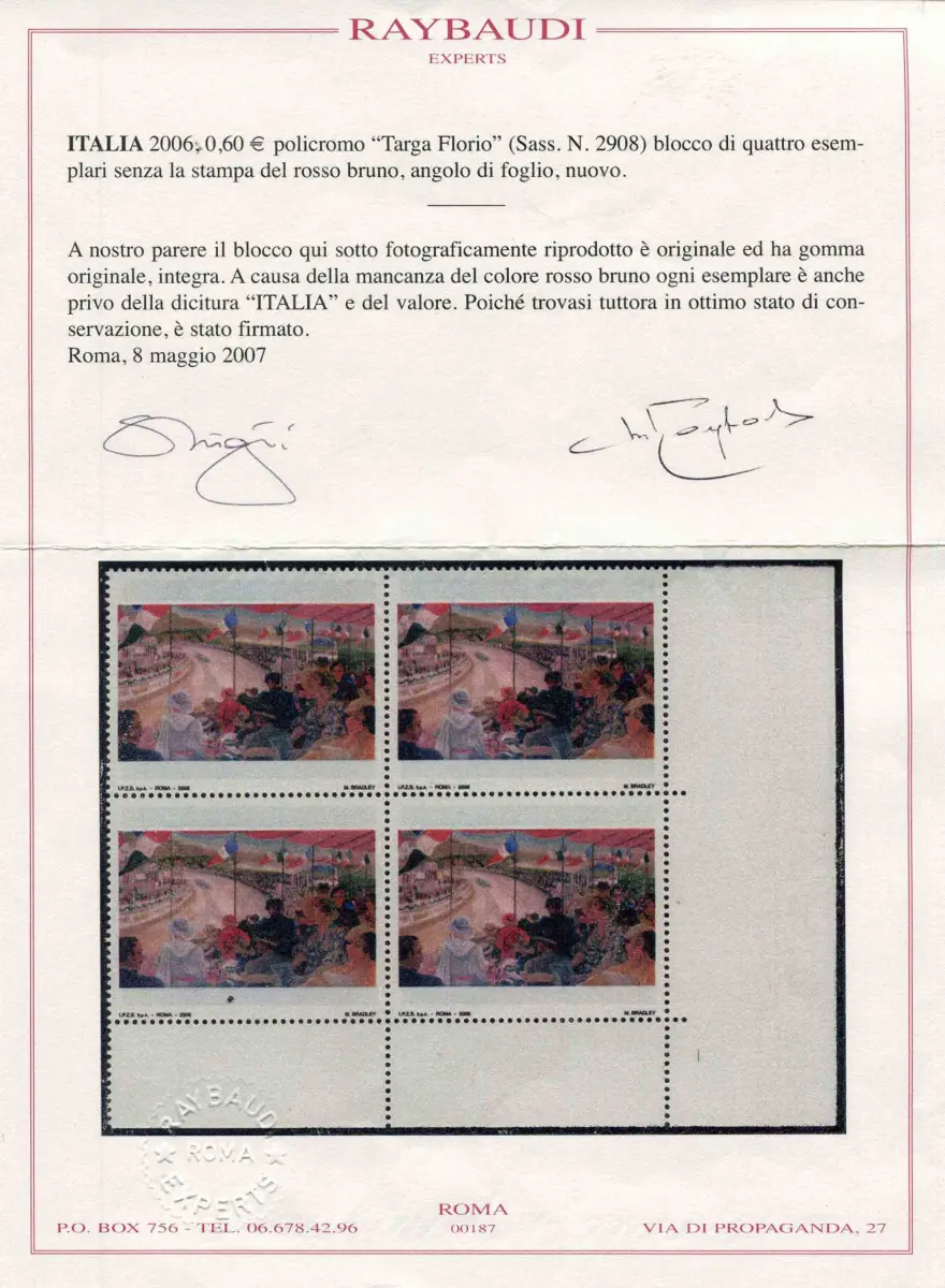 Plakette Florio Sorte ohne Aufdruck rotbraun Vollgummi - MHN - - Plakette Florio Nr. 2908 Viertel a. von f. ohne Aufdruck von rotbraun und daher ohne die Aufschrift Italien und Wert (Sass. spec. Nr. 2557 Ac) - Cert. Ray. Cod. 896/14