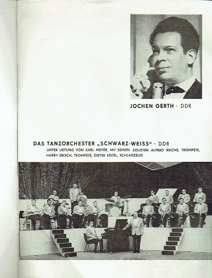 guter bis sehr guter Zustand, geringe Gebrauchs- und Alterungsspuren: Seiten teils etwas eselsohrig - Ecken links unten geknickt, Mitwirkende: Tanzorchester "Schwarz-Weiß", Billy Sanders (ganzseitiges Foto), Juditha Čeřovská, Manfred Krug, Jörg Maria Berg (ganzseitiges Foto), Lena Bacciarelli (Polen), Zbigniew Kancler, Ralph Heid (Schweiz) und Edith Haas, Softcover, ca. 16,5 x 23,5, 12 Seiten mit 19 Bildern