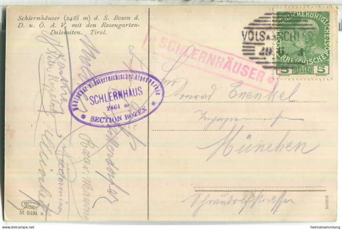 Schlernhäuser mit den Rosengarten und Dolomiten - Verlag Joh. F. Amonn Bozen - Stempelspur (E88714) gel. 1913