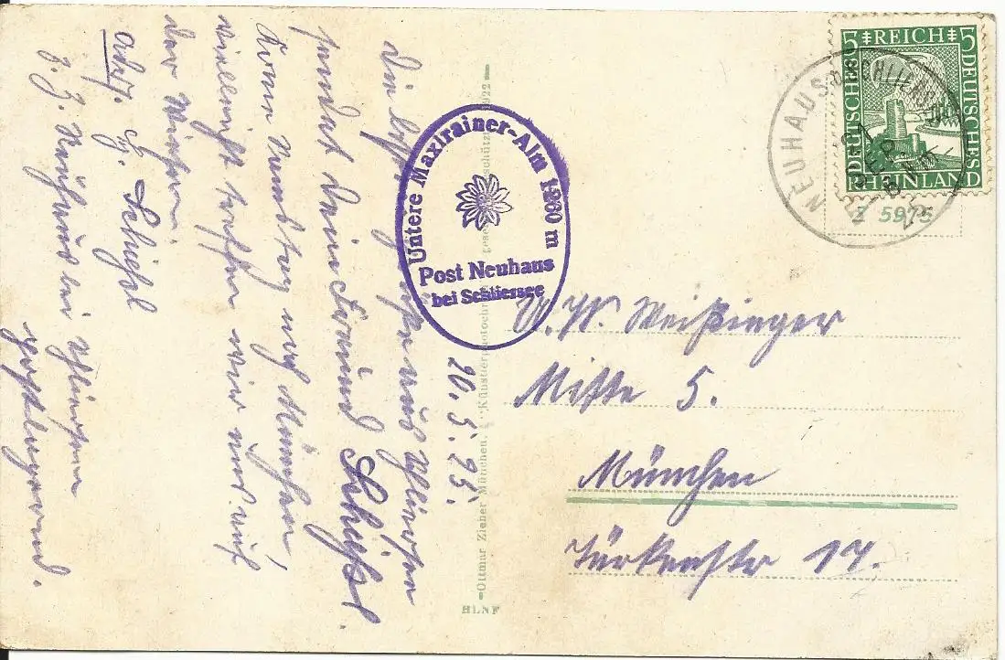 Schliersee, 1925 v. Neuhaus gebr. Farb AK m. Maxlrainer Alm-Stempel.