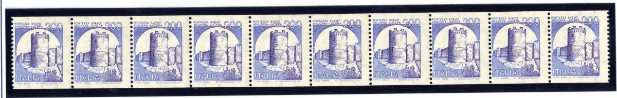 MNH - Vollgummi - Schlösser Spulenausgabe Lire 200 Streifen von zehn Exemplaren ohne die fortlaufende Nummer, die normalerweise alle fünf Marken auf der Rückseite schwarz gedruckt wird, außerdem wird die vertikale Verzahnung verschoben - Ungewöhnlich für Ausgabespezialisten Cod. 880/17