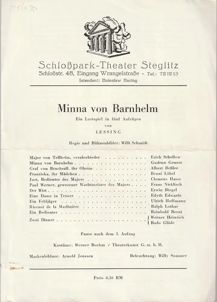 Schloßpark-Theater Steglitz, Boleslaw Barlog: Theaterzettel Gotthold Ephraim Lessing MINNA VON BARNHELM 1948.