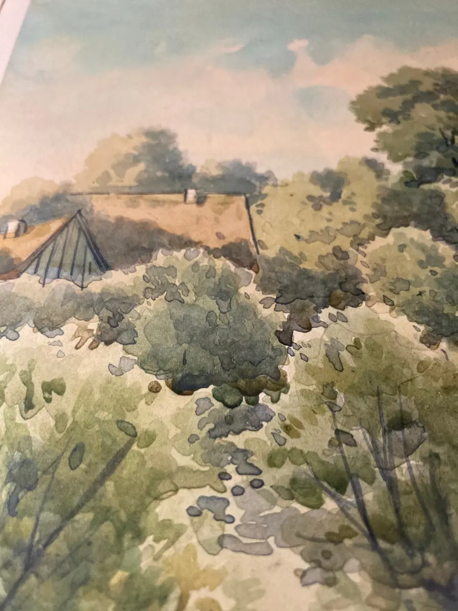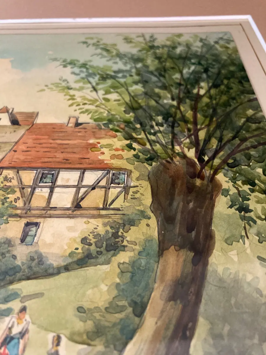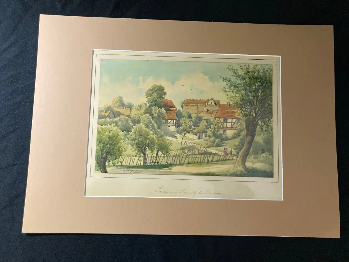 Passepartout außen sauber, Zeichnung in super Zustand, Pappe darunter stärker gebräunt