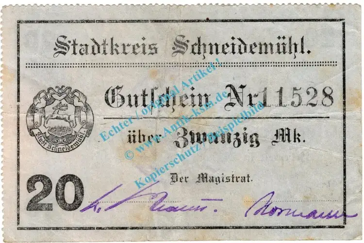 Schneidemühl , Notgeld 20 Mark Schein in gbr. Geiger 480.2 , Posen o.D. Grossnotgeld 1918