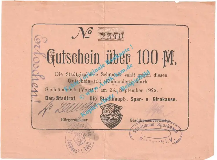 Gutschein / Banknote über Einhundert Mark , Spar & Girokasse Schöneck Vogtl. Großnotgeld 1922Bundesland : Sachsen  ,  Müller : 4120.4