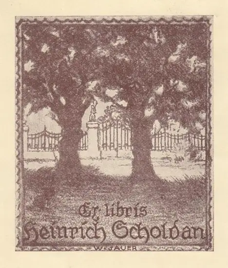 Scholdan, Heinrich. - gestaltet von W(ilhelm / Willy, 1892 - 1930 ) Sauer: Ex libris Heinrich Scholdan. - Ansicht des Schlossparks, Blick durch 2 Bäume auf das Tor.