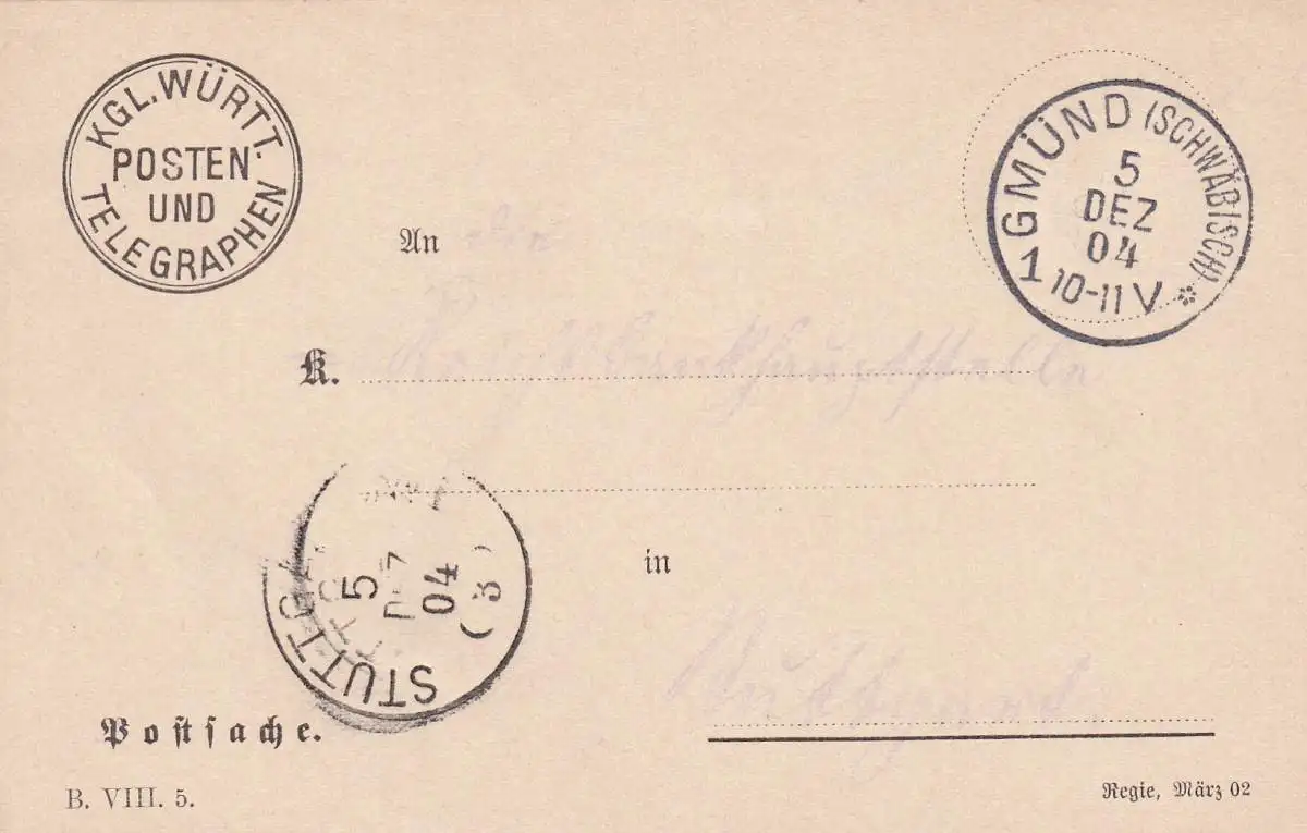 Schwäbisch Gmünd 1904, Postsache nach Stuttgart, Telegraphen Posten