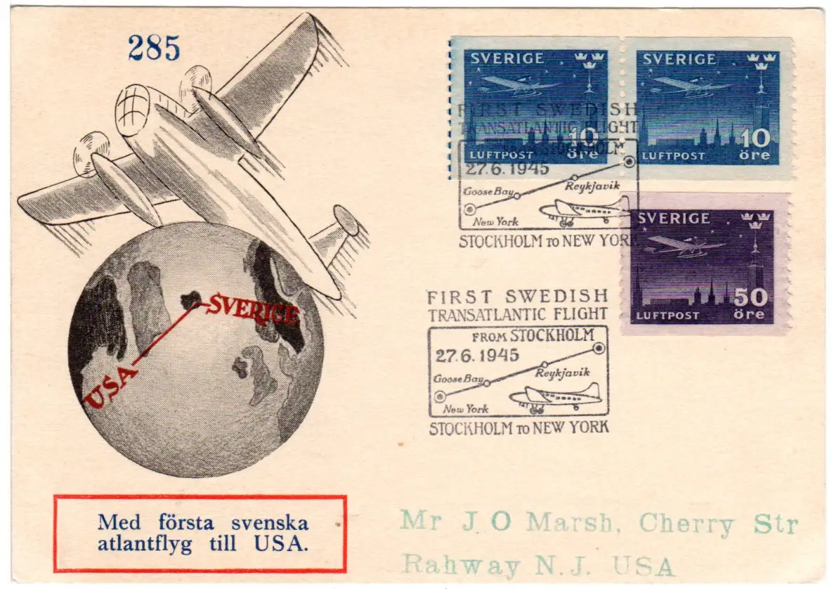 Attraktive Sonderkarte Med första svenska atlantflyg till USA. Via Island und Neufundland.