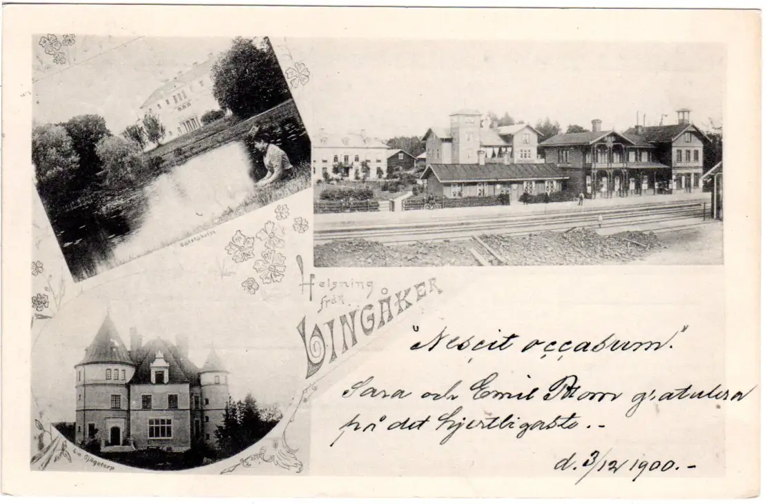 Schweden, Helsning fran Lingaker with Railway Station, 1900 gebr. sw-AK