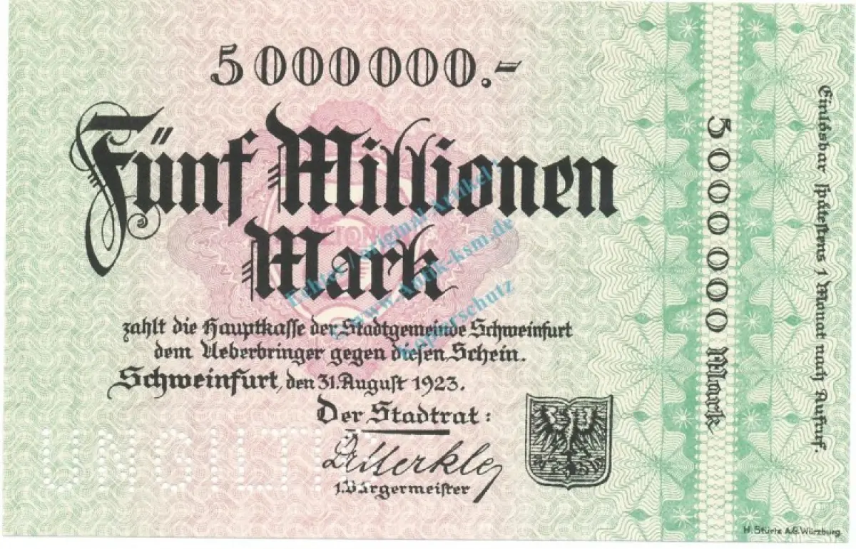 Schweinfurt , Banknote 5 Millionen Mark -MUSTER- unc-kfr. Keller 5092... Bayern 1923 Inflation