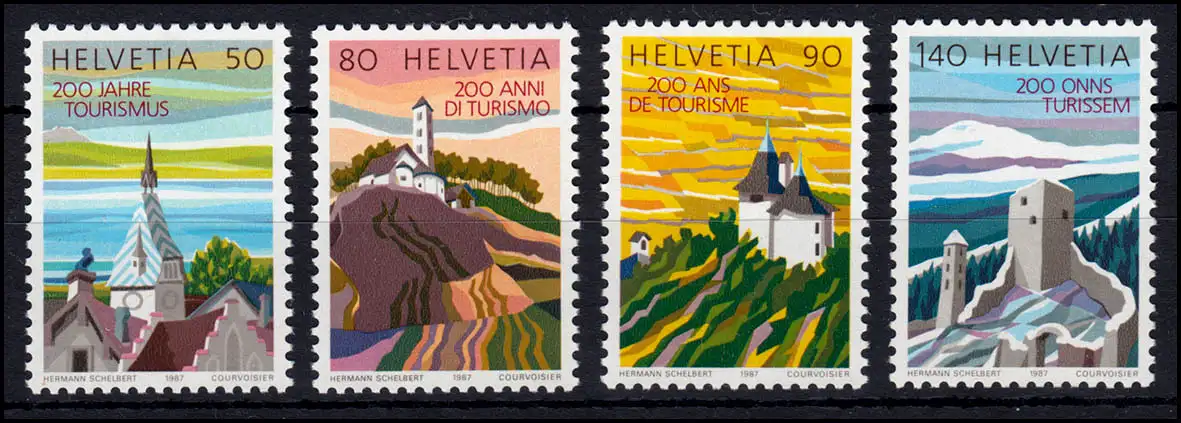 Kompletter Satz zum 200jährigen Jubiläum Tourismus in der Schweiz. Diese Marken aus Bogen zeigen eine gleichmäßige Fluoreszenz - im Gegensatz zu den fleckig phosphoreszierenden Blockmarken.