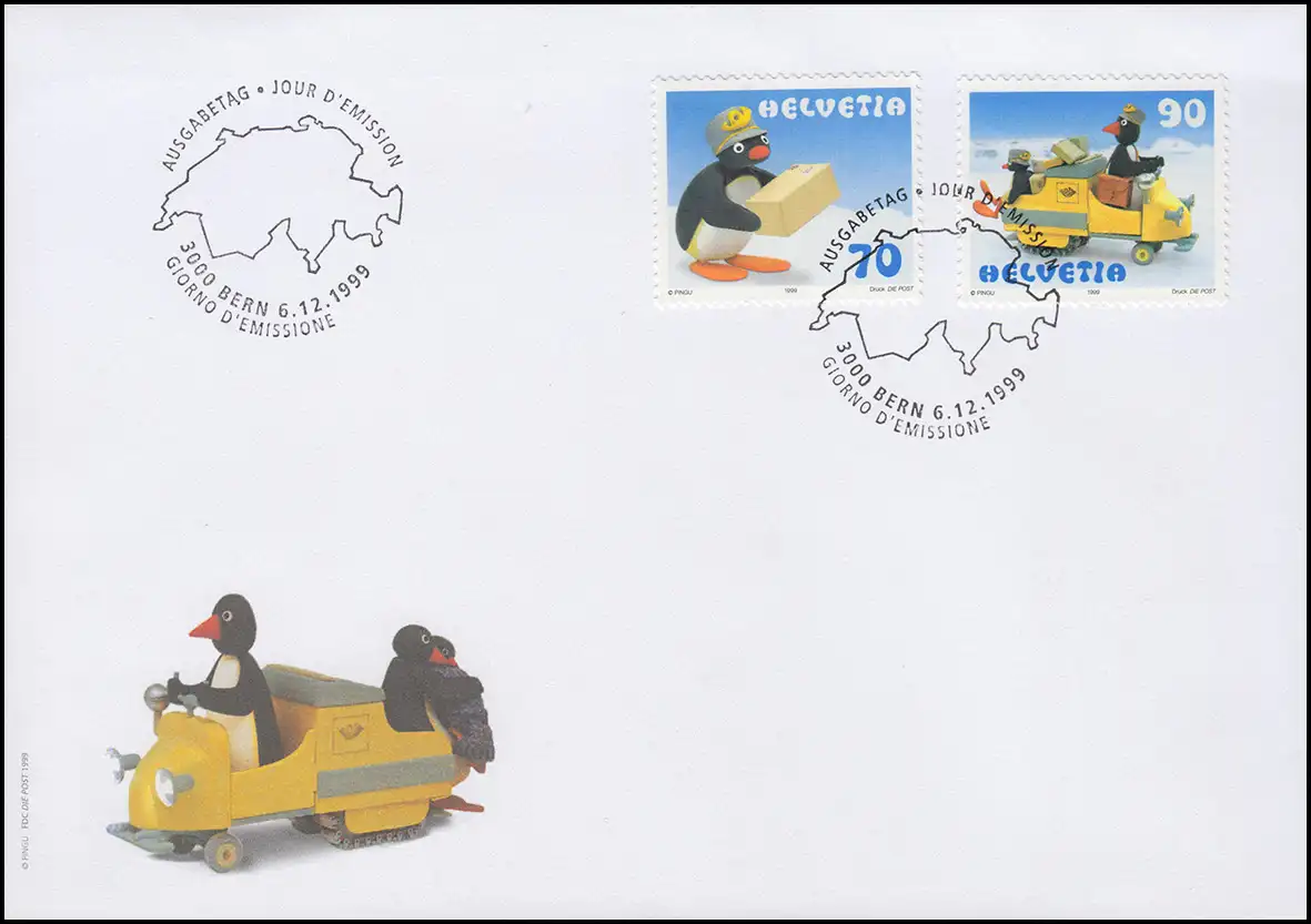 Schweiz 1707-1708 Pingu mit Paketen OHNE Schnur auf Schmuck-FDC BERN 6.12.1999