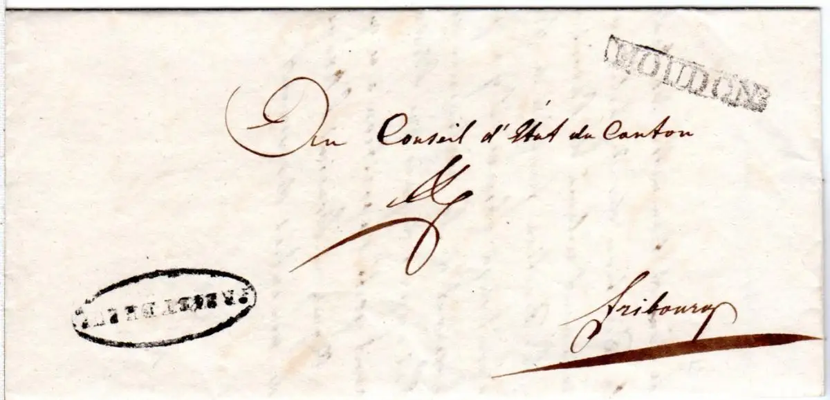 Schweiz 1831, R1 MOUDON auf Brief n. Fribourg.